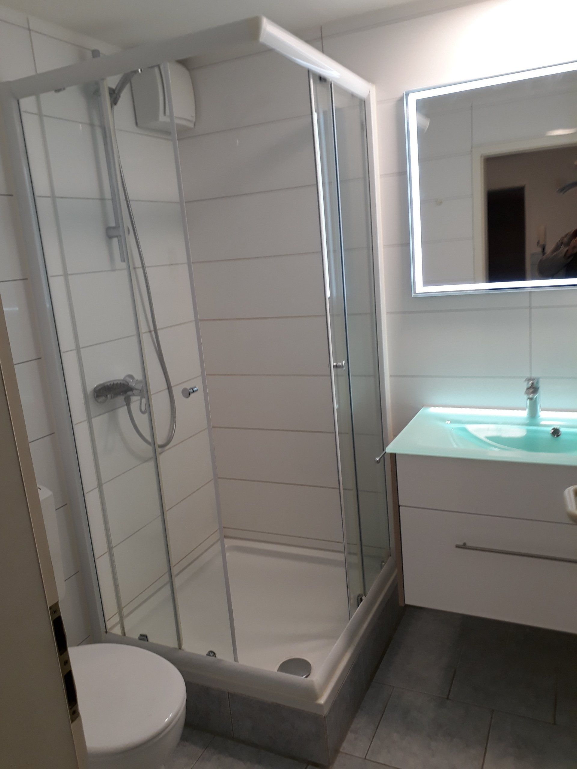 Ein neues Duschbad (8,5 qm groß), Duche, barrierefrei mit einem klappbaren Duschsitz und Haltegriff, sind vorhanden. Ein Fön ist im Bad. Es gibt eine separate Gästetoilette, die bei Bedarf genutzt werden kann.