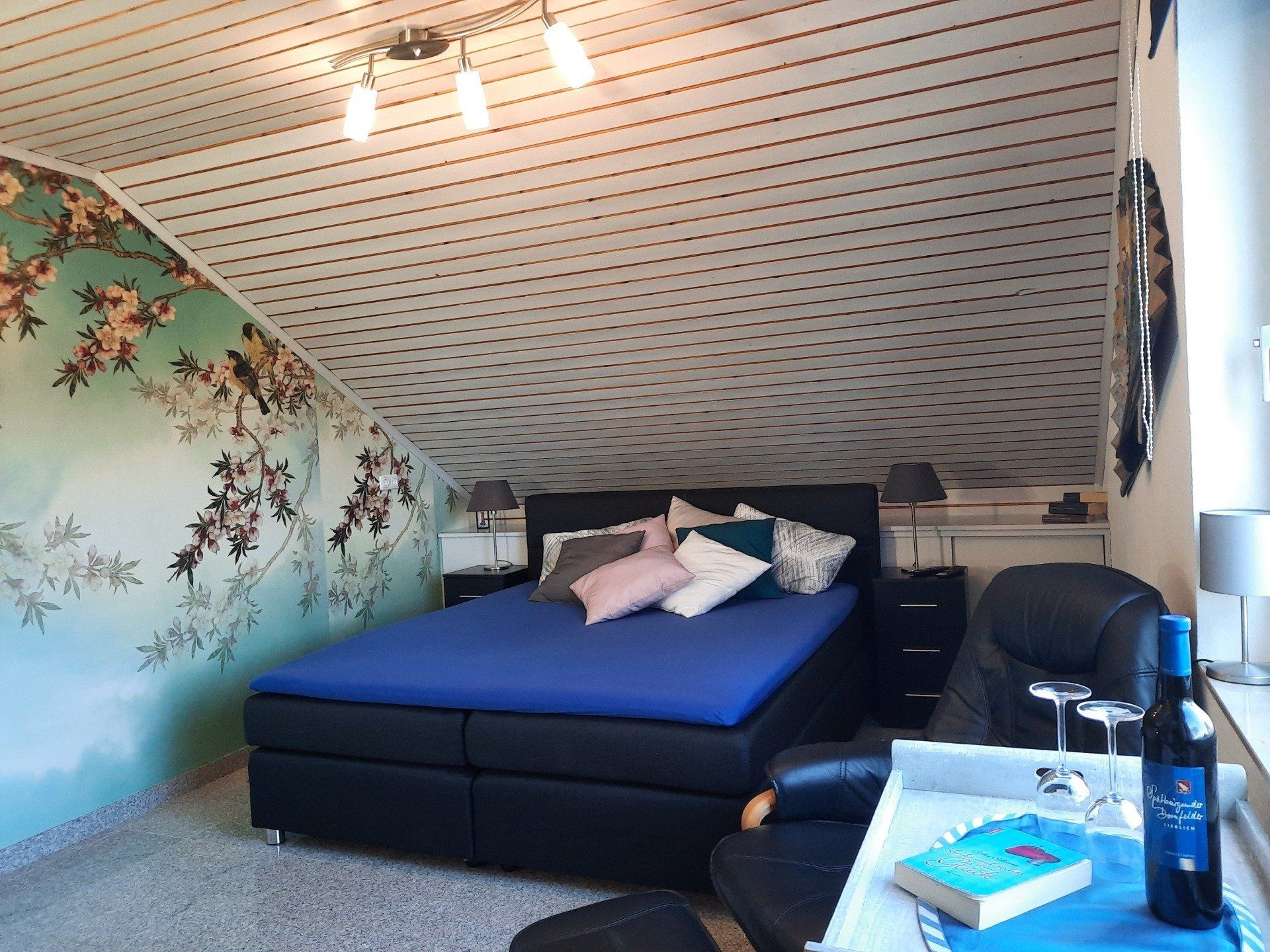 Das Schlafzimmer hat 14qm; es gibt ein Bett mit dreifach elektrisch-verstellbarem Rost der Firma Hülsta 2x2m mit zwei Matratzen (Komfort - Liegehöhe 50 cm) und ausreichend Kleiderschränken; zum gemütlichen Fernsehen (vom Bett aus) gibt es einen Flachbildfernseher.