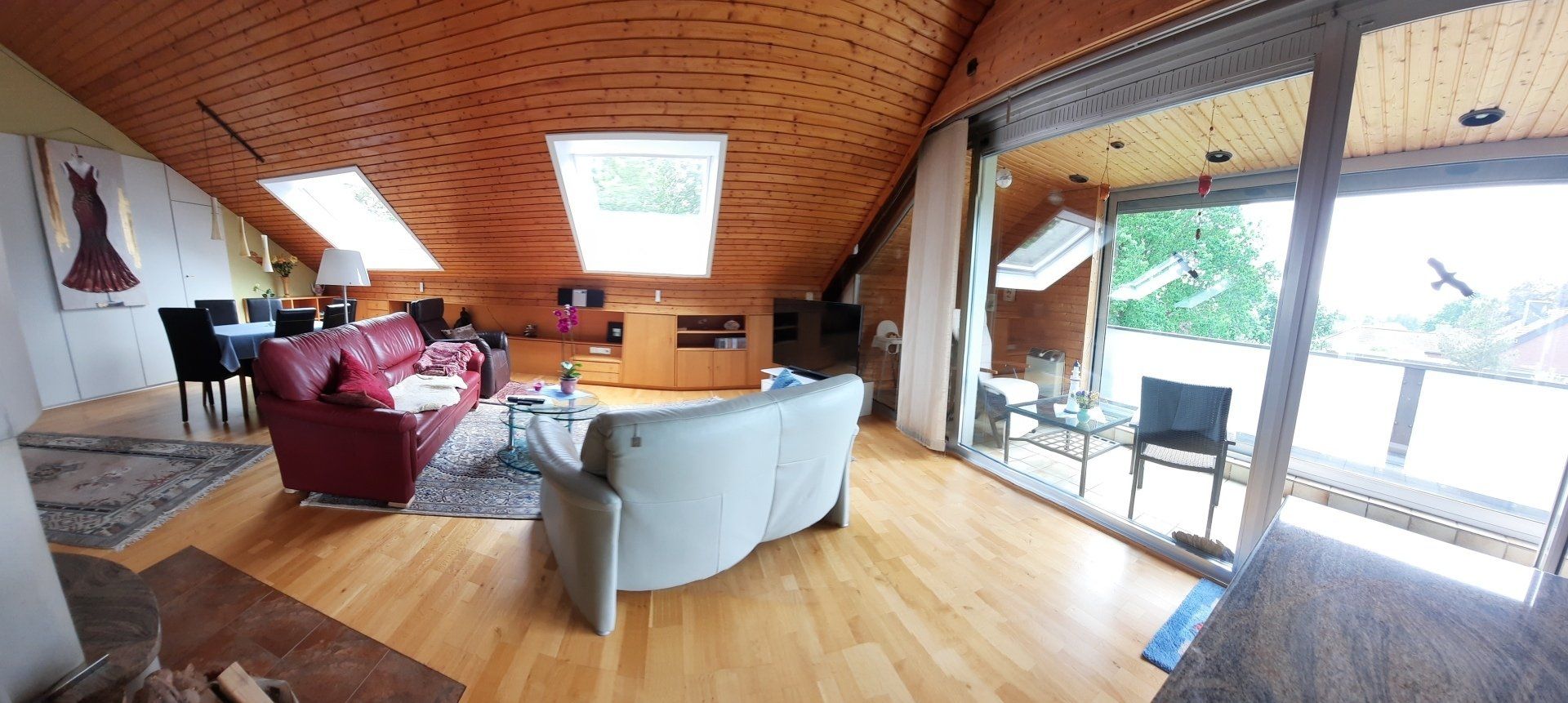 Exclusive, für Privatnutzung sehr hochwertig ausgestattete Wohnung ist ca. 100qm groß, hat elektrische Rolläden und Fußbodenheizung und helle hohe Räume ( Giebelhöhe im Wohnraum 4 m)